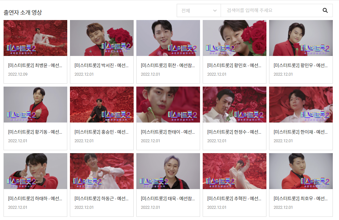 TV조선 홈페이지에 미스터트롯2 참가자들이 공개되었습니다. 118명의 참가자가 트로트 대결을 펼칩니다.