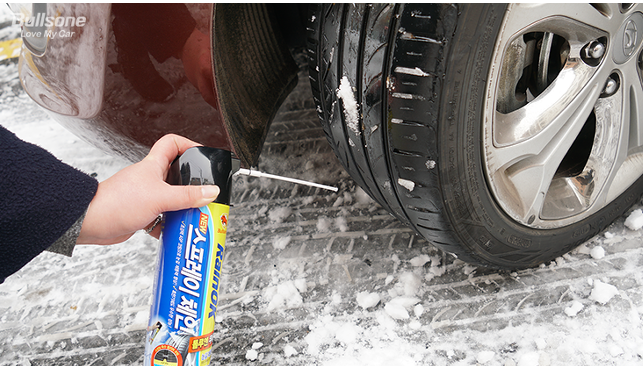 스프레이 체인을 타이어에 뿌리는 사진